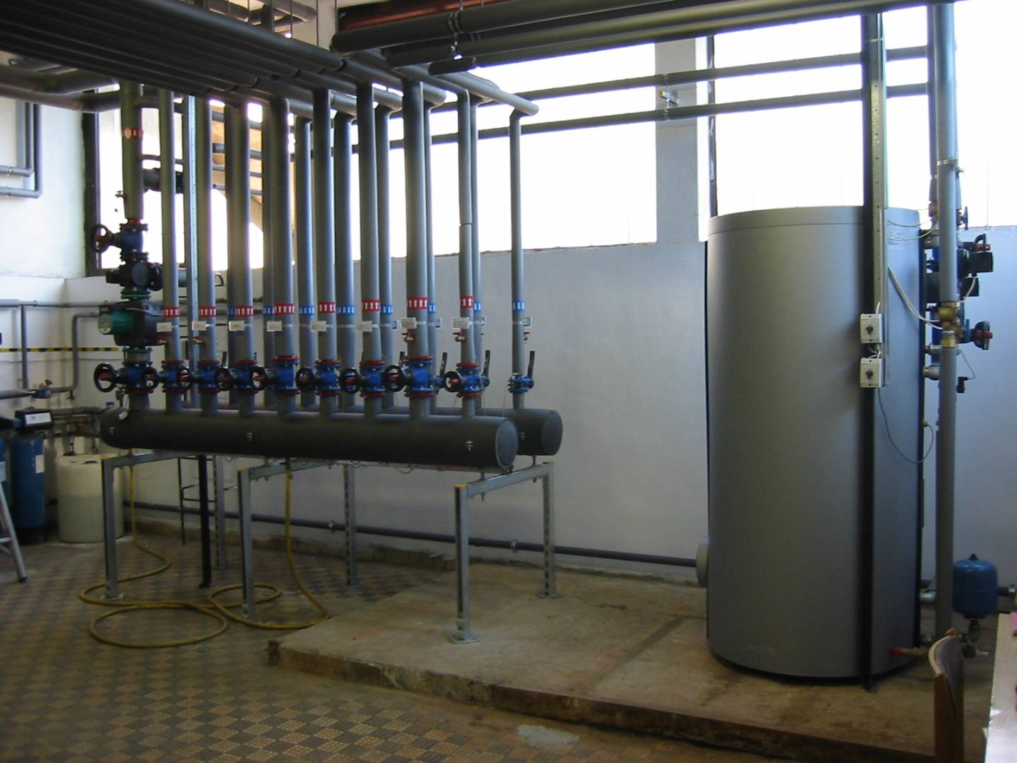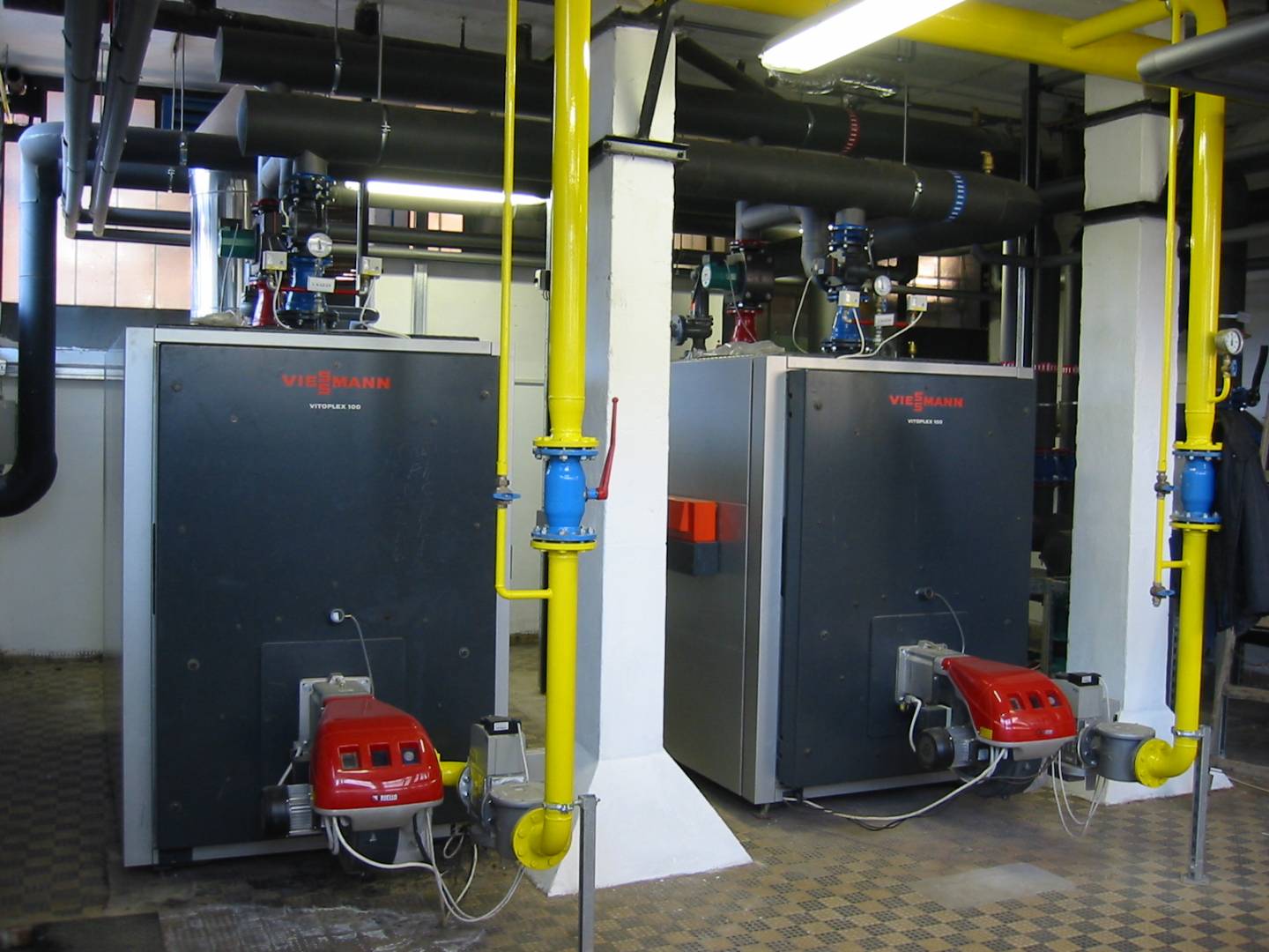 Teljes kazánházi és hőközponti rekonstrukció, meglévő távvezeték és melegvíz ellátó rendszer cseréjével. 2 db VIESSMANN Vitoplex100 gázkazán és RIELLO RS/M gázégők beépítése.
